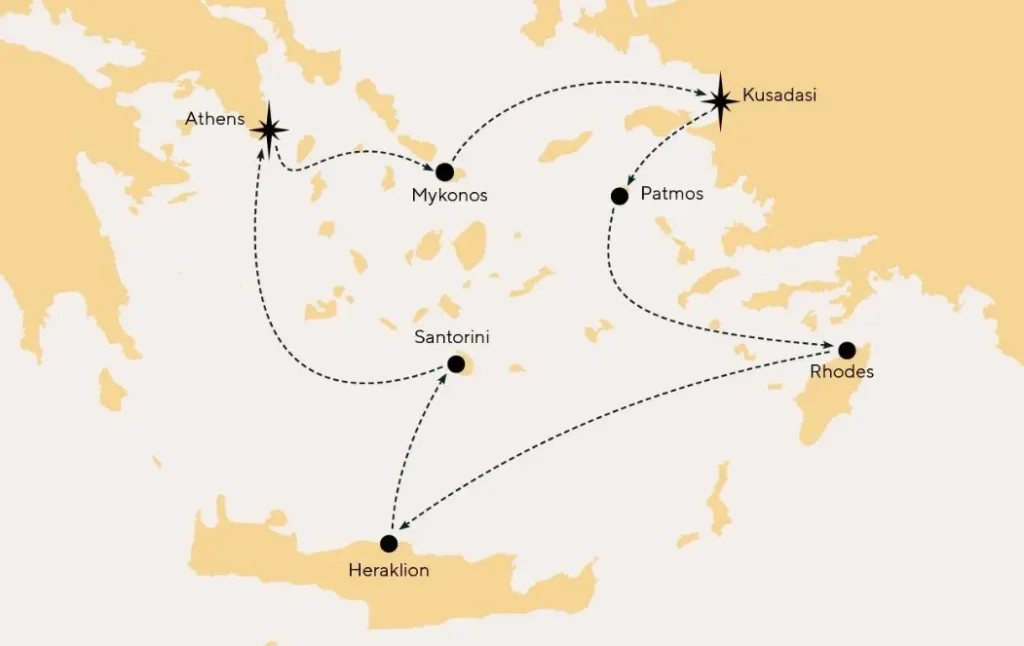 • Aug 5: Heraklion, Crete (07:00–12:00) & Santorini (16:30–21:30)