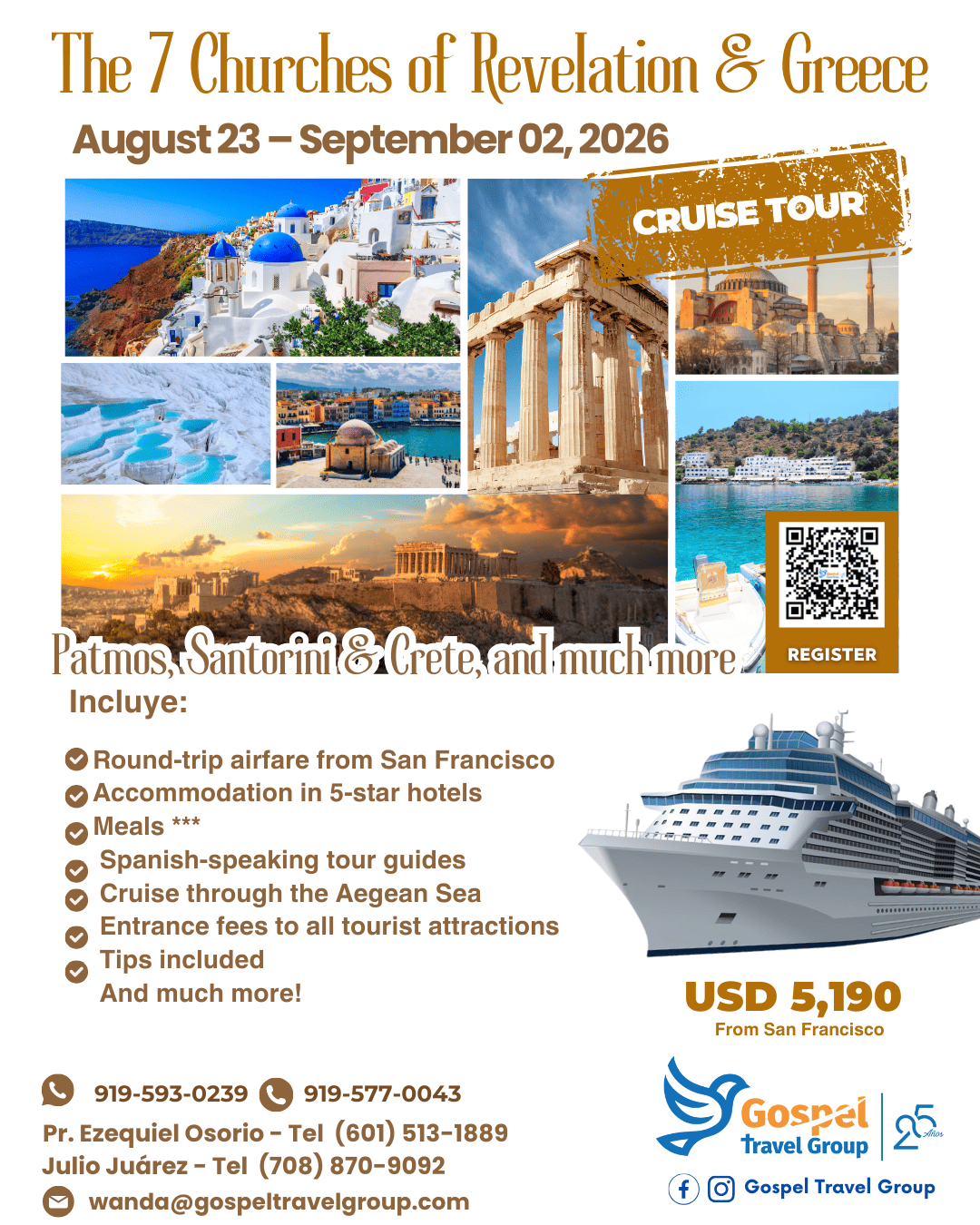 Price p/p: $5,190.00 Deposit upon registration (non-refundable): US$500 Initial Payment 50%: before February 23, 2026 Final payment 50%: before June 23, 2026