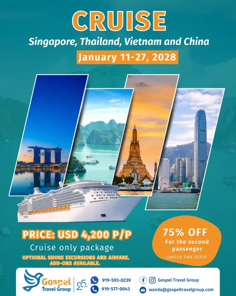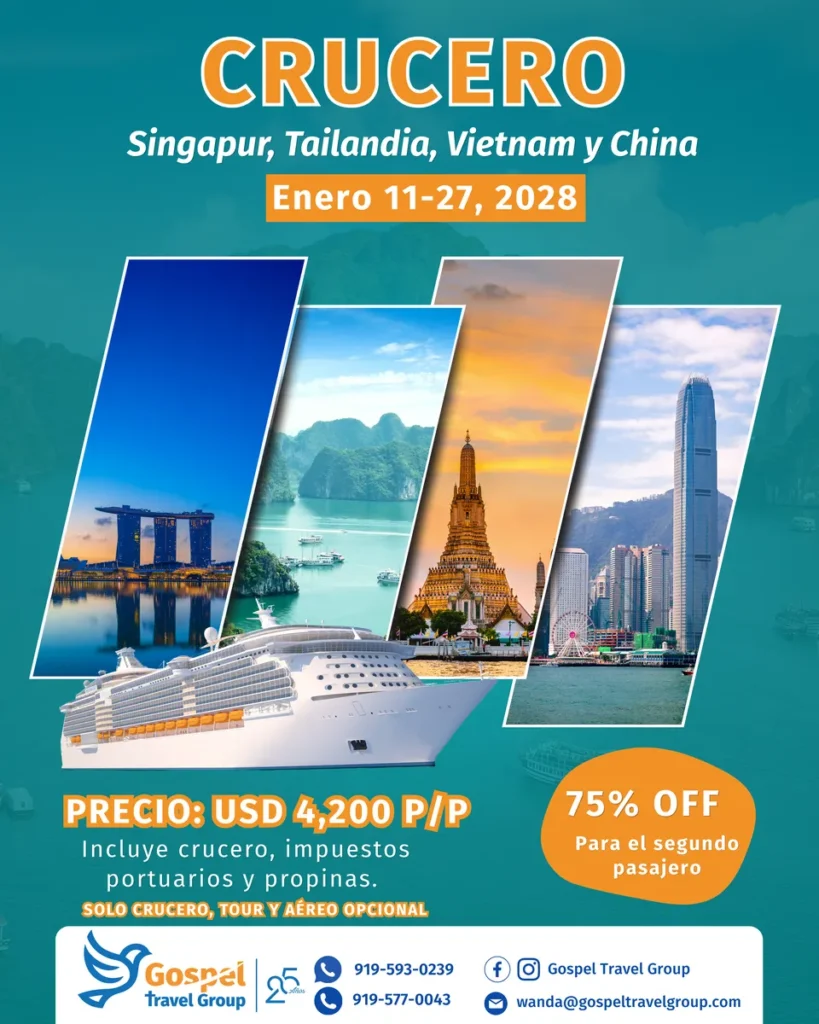 #GospelTravelGroup #CruceroAsia2028 #AsiaEnCrucero #ViajaConNosotros #Singapur #Tailandia #Vietnam #China #Vacaciones2028 #OfertaDeViaje #TurismoInternacional #ViajesEnGrupo #CruceroDeLujo #ReservaHoy